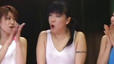 웃고있는 일본 여자 스프레드들은 털이 음부